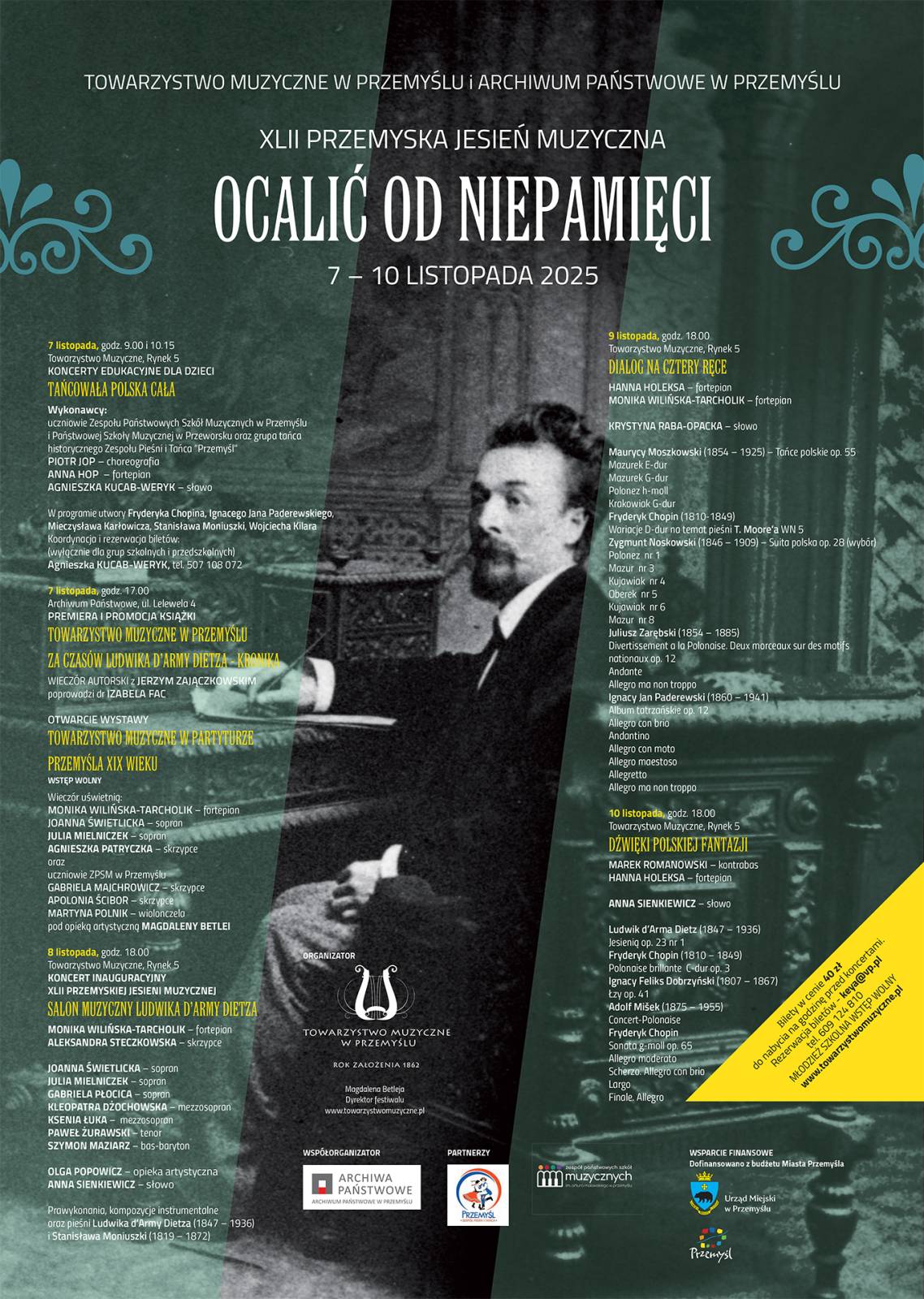 Towarzystwo Muzyczne w Przemyślu serdecznie zaprasza i zachęca do udziału w 42 Przemyskiej Jesieni Muzycznej, która odbędzie się w Przemyślu w dniach 7 – 10 listopada 2025 r. Ponieważ w tym roku wydarzenie dofinansowane jest tylko przez Urząd Miejski w Przemyślu, ma ono bardziej kameralny wymiar, natomiast jego szczególnym walorem, zgodnie z tytułem OCALIĆ OD NIEPAMIĘCI, będzie przypomnienie, zaprezentowanie i promowanie niezwykle bogatych, często nie uświadomionych albo mało znanych tradycji muzycznych Przemyśla ze szczególnym uwzględnieniem II połowy XIX wieku.