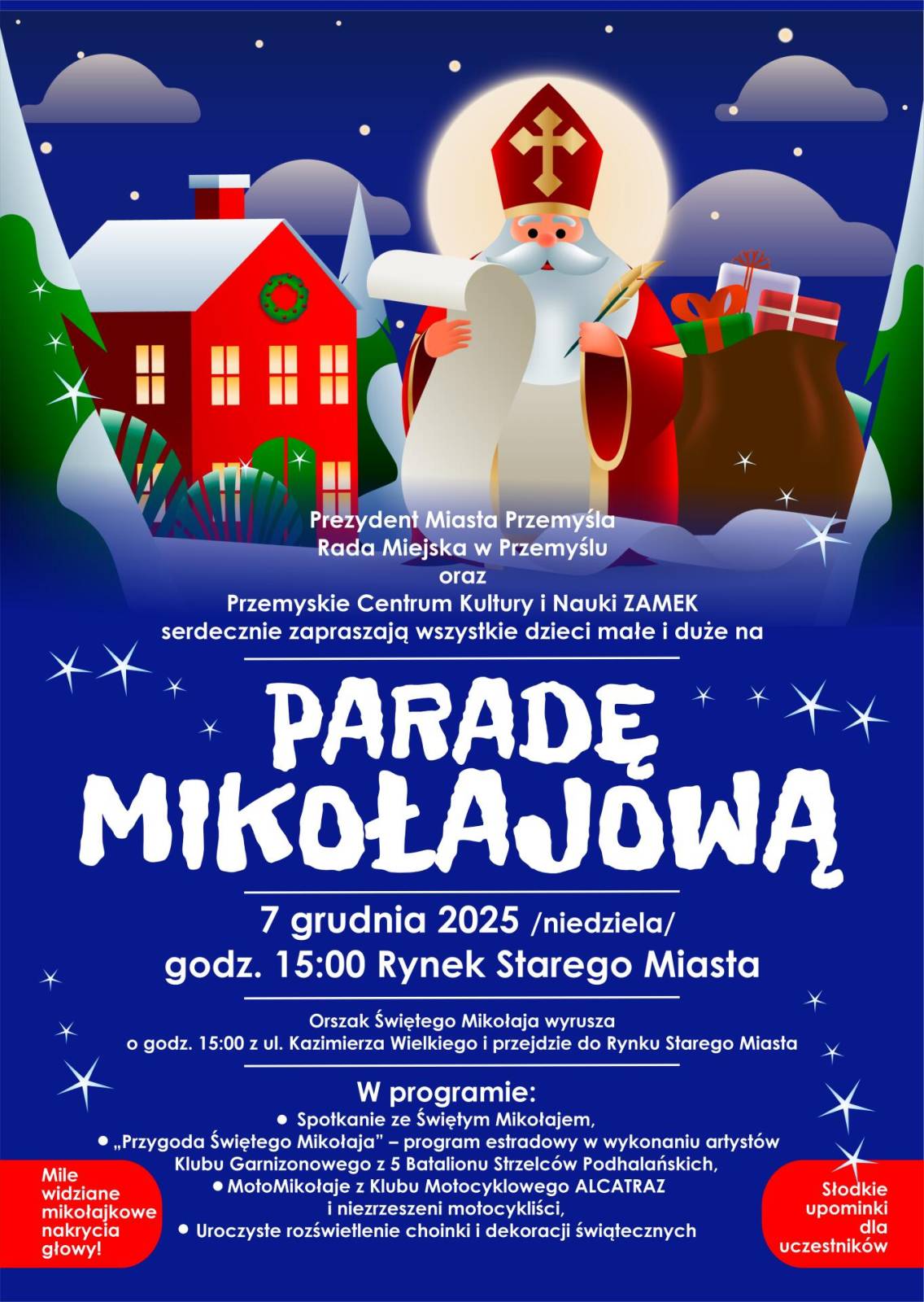 Zbliża się jedno z najcieplejszych i najbardziej lubianych wydarzeń zimy w naszym mieście. Prezydent Miasta Przemyśla, Rada Miejska w Przemyślu oraz Przemyskie Centrum Kultury i Nauki ZAMEK z ogromną radością zapraszają wszystkie rodziny, dzieci i dorosłych, wszystkich tych, którzy wciąż noszą w sobie odrobinę dziecięcej magii – na pełną koloru i świątecznego blasku PARADĘ MIKOŁAJOWĄ.